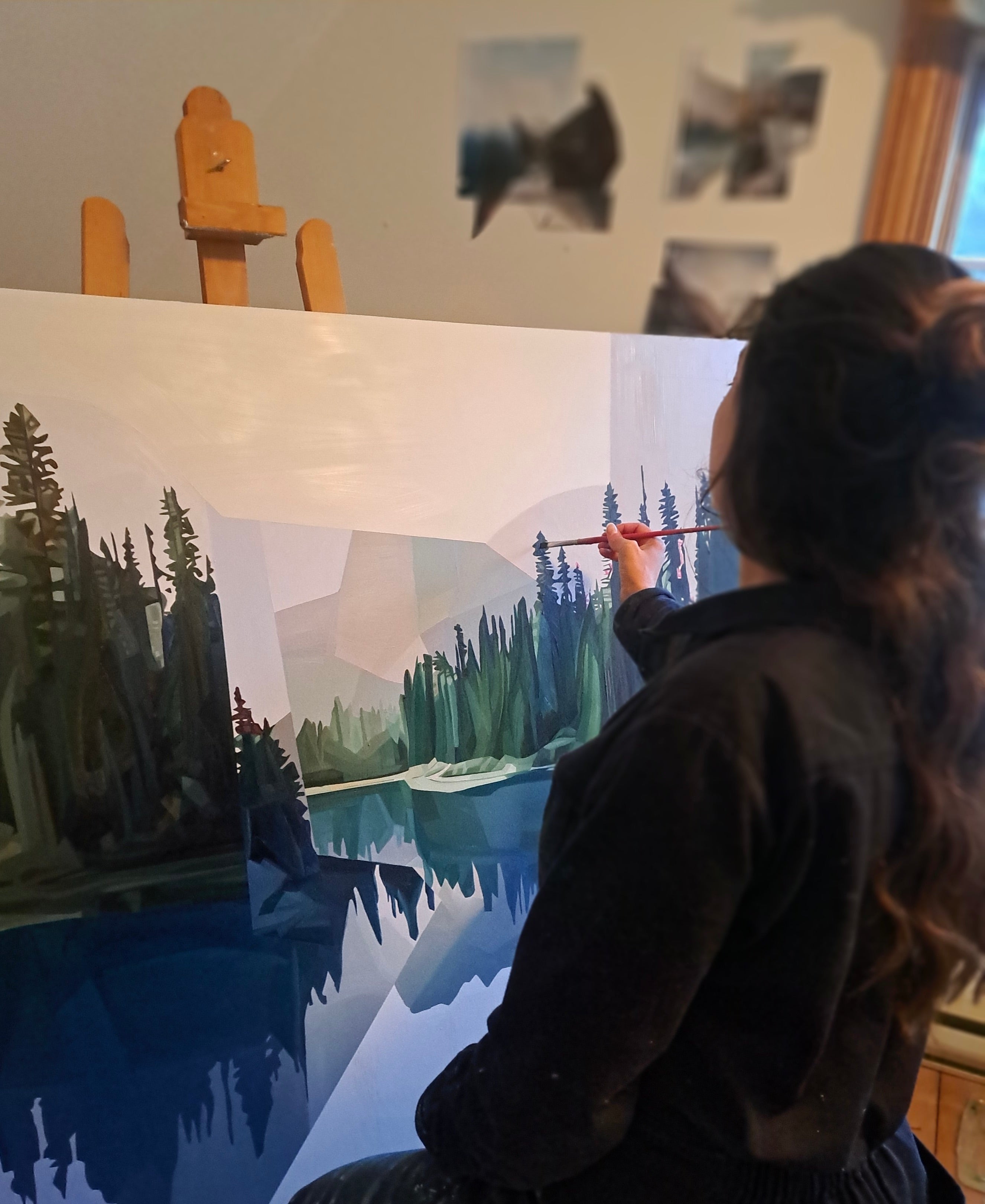 Learn more about Samantha"My work begins with collage, which serves as the foundation of my process and functions as a form of sketching. When these collages are translated into paintings, their constructed layers remain visible in the long, linear segments and flat geometric planes that divide each landscape. Using a natural colour palette, I depict intuitive representations of oceans, forests, rock formations, and dramatic coastal light. By incorporating multiple horizon lines, fractured geometric shadows, and shifting spatial anchors, each composition invites the viewer to move between surface and depth with every viewing."